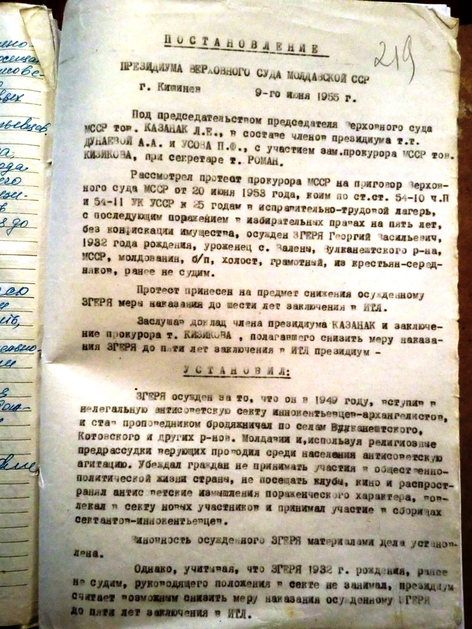 Decision of the Presidium of the Supreme Court of the Moldavian SSR Concerning the Case of Gheorghe Zgherea. 9 June 1955 (in Russian)