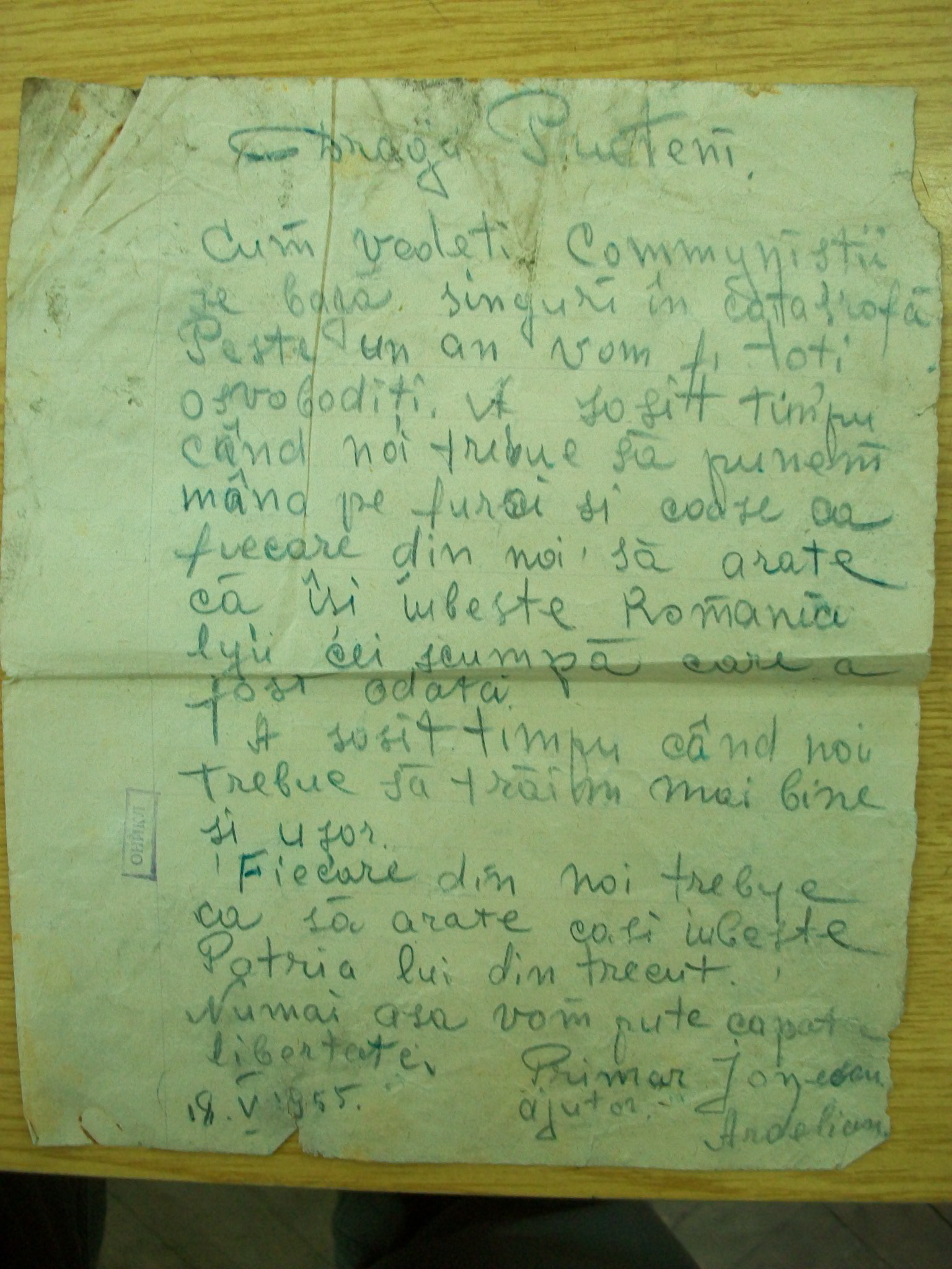 On the night of 18/19 May 1955, after suffering from verbal and physical abuse at the hands of two police officers at the Chişinău railway station, Zaharia Doncev produced four handwritten texts (leaflets) with a radical anti-regime message. He spread the four leaflets on the premises of the railway station and in the surrounding area. Doncev wrote the text on four white sheets of paper of notebook format, using a pencil. Three of the leaflets were in Russian, while the fourth was written in Romanian, in Latin script. The content of the Romanian-language and Russian-language texts was different. The Romanian text emphasised the crisis of the Soviet regime and appealed to the Moldavian people to rebel and show their “love” for Romania in order to regain their freedom: